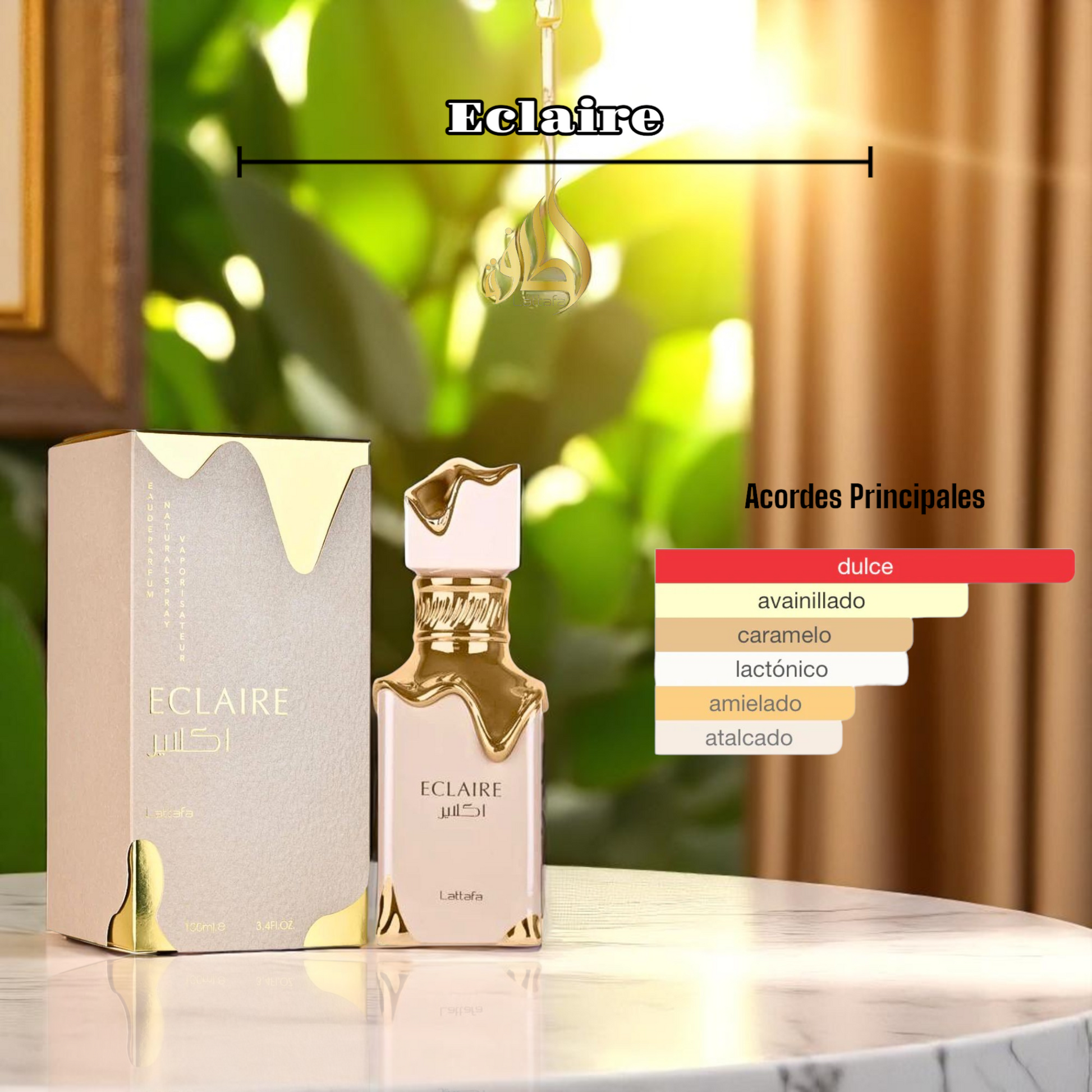 Eclaire de Lattafa es una fragancia femenina dulce, cremosa y envolvente que seduce desde el primer instante. Su aroma mezcla notas Caramelo con toques florales suaves y una base cálida que aporta profundidad. Es como un postre delicado transformado en perfume: suave, elegante y adictivo.